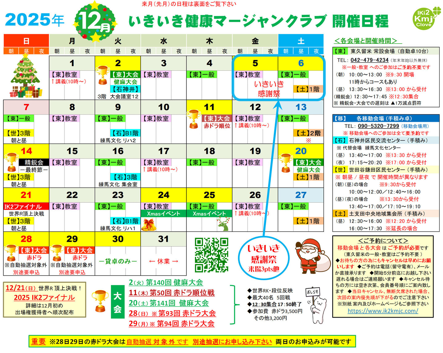 ※ 抽選結果は開催前月 1日から5日までにカレンダー下にPDFファイルで発表致します また東久留米会場内に掲示致します